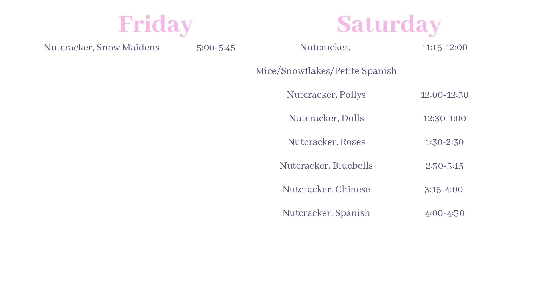 Dancers must attend rehearsals wearing proper ballet attire, including tights, leotards, hair in buns and off face, and ballet shoes. Dancers are allowed two missed rehearsals due to illness or schedule conflicts. More than two missed rehearsals will require additional rehearsal times. Schedule is subject to change.