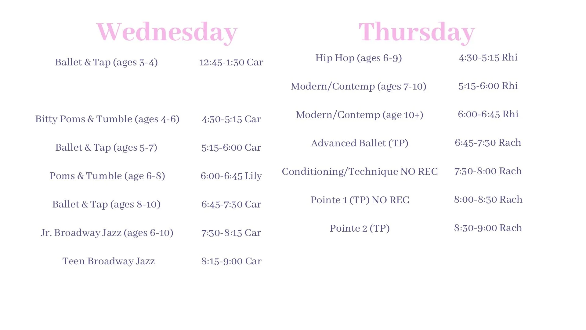 If your child is currently dancing in the Fall Session, they will stay in their current class times, and you can add more! Every dance class is in the recital unless it says NO RECITAL.
